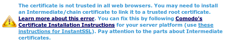 698You need to install COMODORSADomainValidationSecureServerCA.crt as ssl.ca-file (SSLCertificateChainFile). After web server restart you should see the following picture: