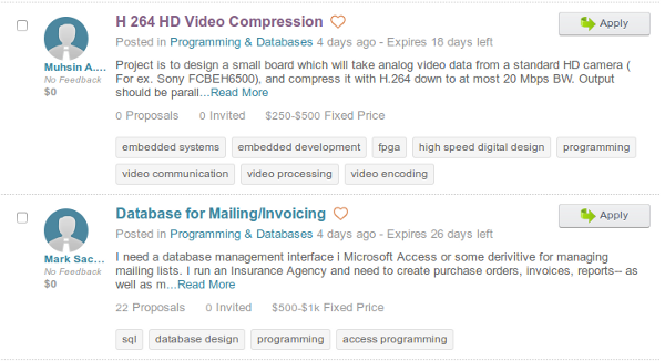 Below you will find two sample projects announced on guru.com. First: is hardware-related work, 2nd is a plain database: