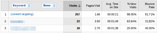 As you can see most traffic comes from "content targetting" (partner sites). Best keyword gave 10 times less visitors. But: see "Bounce Rate" and "Avg. Time on Site" parameters. >80% of visitors exited immedietly from my site. Keyword-based targetting gave better results: lower bounce rate and longer time spent on site.